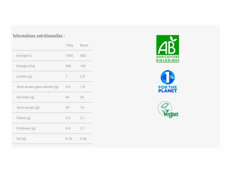 - Cette barre fabriquée à base d’ingrédients naturels peut contenir des petits morceaux de coquilles ou d’écorces.